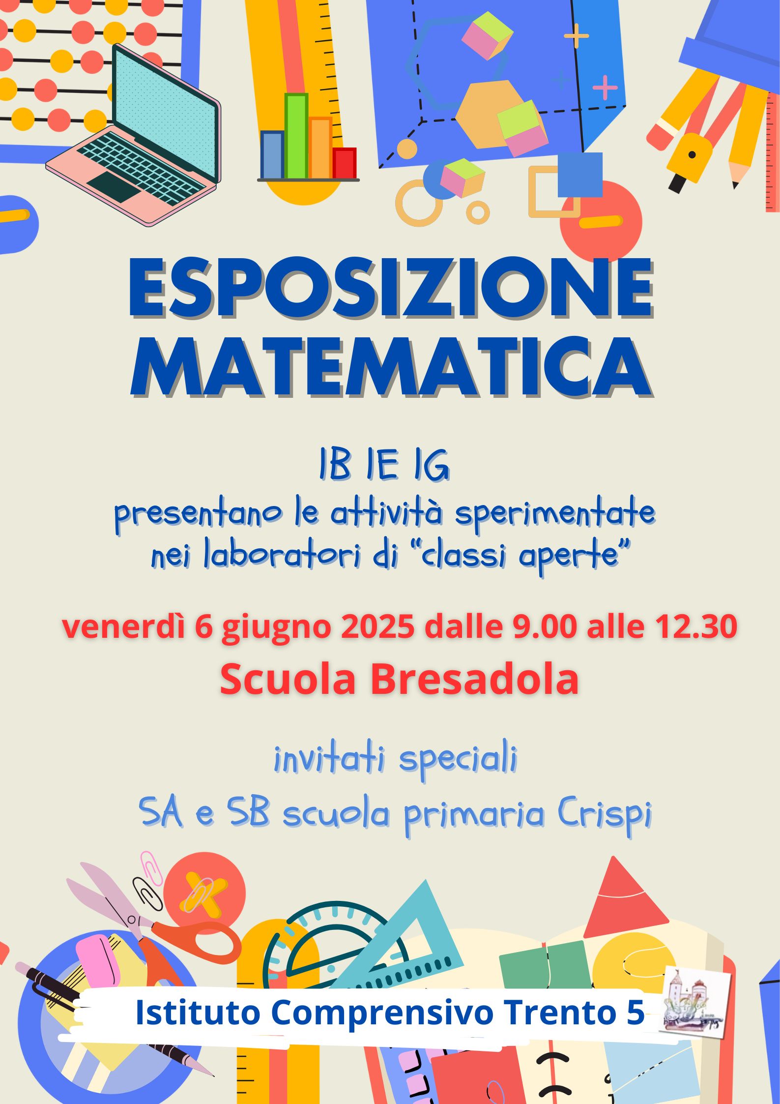 Il 6 giugno 2025 presso la Scuola Bresadola in orario 9.00 - 10.30 e 11.00 - 12.30, le classi 1B, 1E, 1G, hanno presentato i laboraori di matematica sviluppati nel percorso di classi aperte 2024/25.
