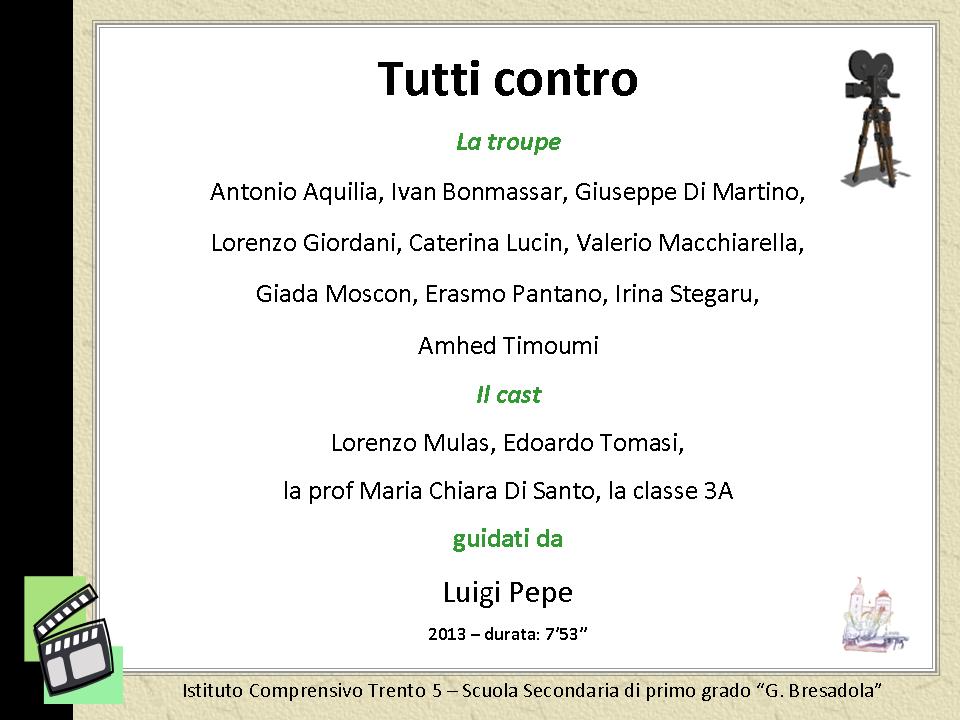 Realizzazione del cortometraggio dal titolo TUTTI CONTRO (durata 7' 53'')