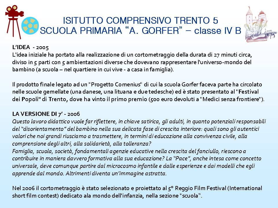 Officina Gorfer 31 Gennaio 2014 Ultima modifica: 11 Settembre 2022 Visite: 5060 LEZIONI DI PACE cortometraggio di 7' classe 5B - a.s. 2004/2005 docente: Andrea Bombardelli Questo indirizzo email è protetto dagli spambots. È necessario abilitare JavaScript per vederlo. (clicca sull'immagine per visualizzare il film) presentazione del lavoro didattico