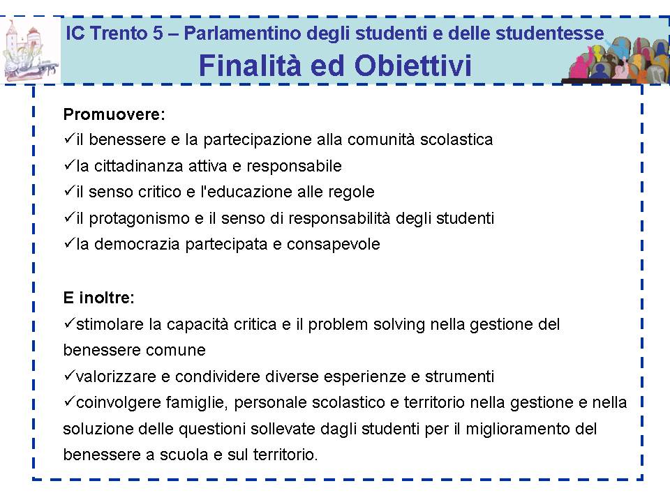 Nella fase iniziale il percorso è stato destinato alle sole classi seconde e terze della scuola secondaria, ma dall'a.s. 2015/2016 tutte le classi sono coinvolte e ogni classe elegge due rappresentati.