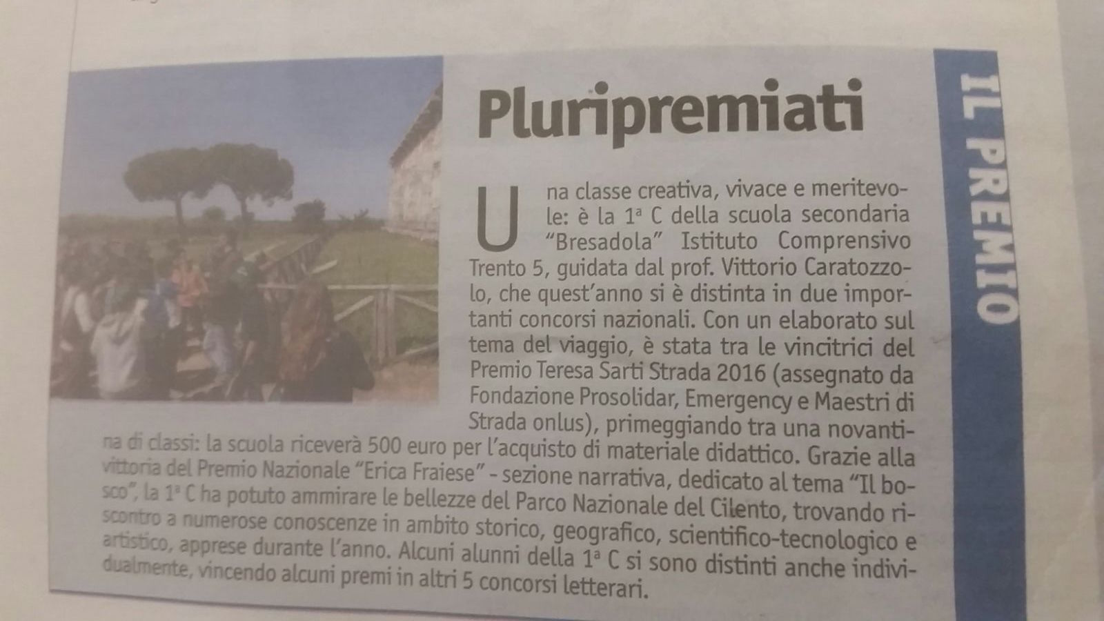 La Fondazione Prosolidar, Emergency e Maestri di Strada Onlus, in merito al bando Premio Teresa Sarti Strada 2016, comunica che la vostra Scuola Secondaria "Giacomo Bresadola" Istituto Comprensivo Trento 5, è tra le vincitrici grazie all'elaborato realizzato della classe 1C.
