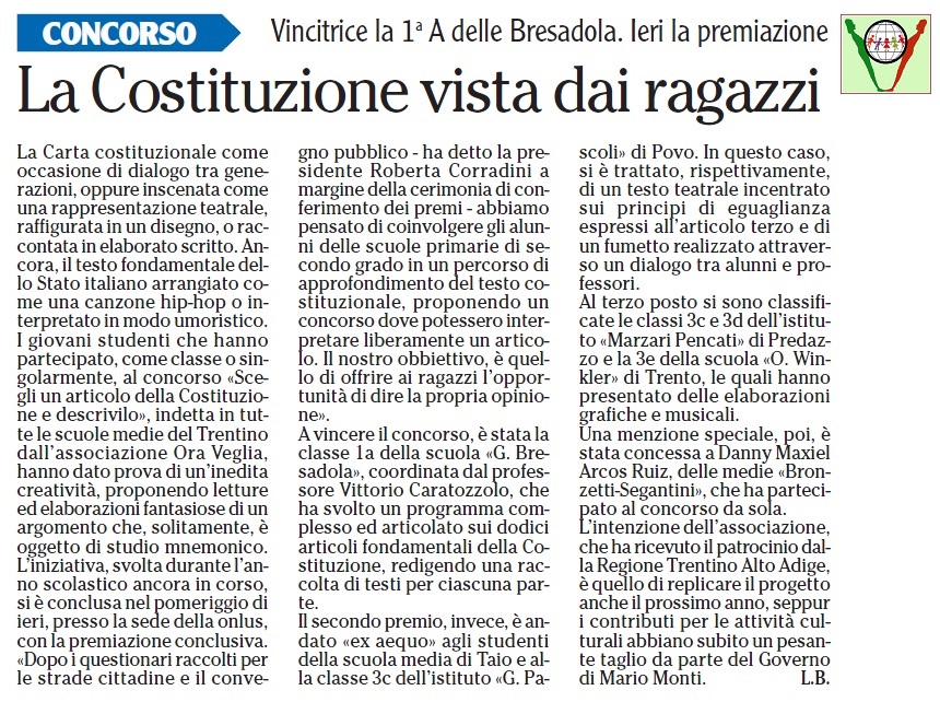 Nell'ambito dei progetti di educazione alla cittadinanza, l'Associazione ORA VEGLIA onlus di Trento continua il lavoro iniziato nel 2011 sulla Costituzione della Repubblica italiana.
