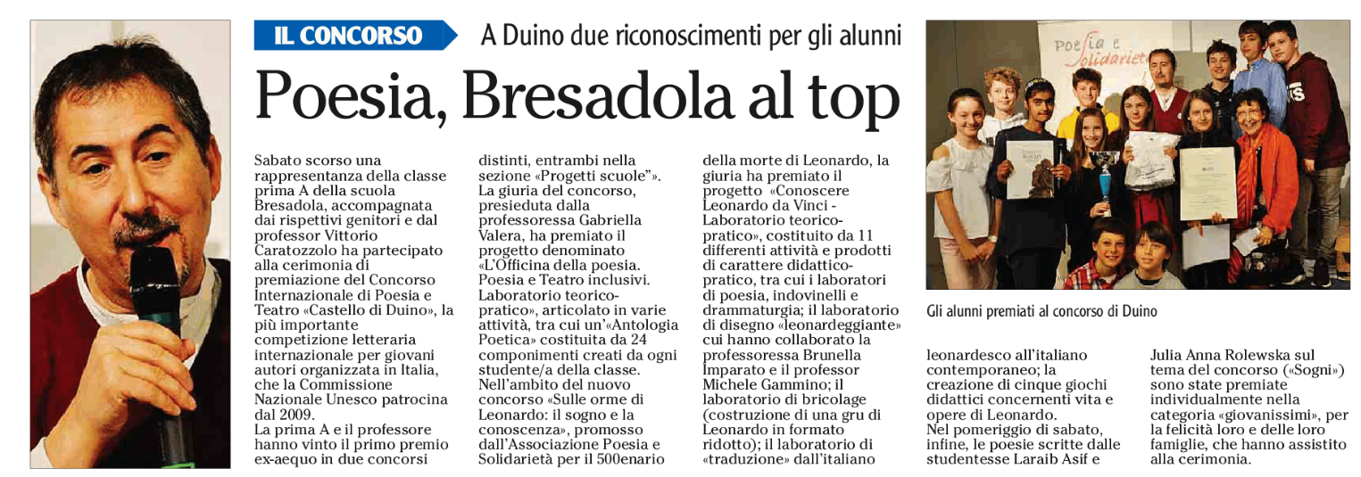 Sabato 30 marzo 2019 una rappresentanza della classe 1A, accompagnata dai rispettivi genitori e dal prof. Vittorio Caratozzolo ha partecipato alla cerimonia di premiazione del Concorso Internazionale di Poesia e Teatro "Castello di Duino" 2018