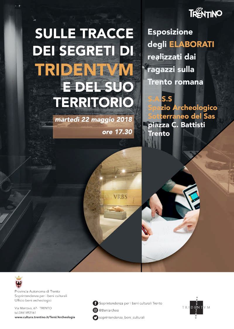 Martedì 22 maggio, alle ore 17.30, a Trento, presso lo Spazio Archeologico Sotterraneo del Sas (piazza Battisti) si terrà la presentazione del progetto didattico Sulle tracce dei segreti di Tridentum e del suo territorio, realizzato in collaborazione con 39 classi di varie scuole trentine, tra le quali la classe 1G, che espone i lavori sul mosaico romano.