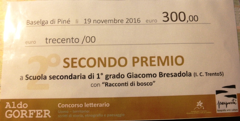 Per la sezione "Scuole" la classe 2C della "G. Bresadola" ha vinto il 2° premio, con un'antologia di brani tratti dalla raccolta «Racconti di Bosco», già vincitrice, nel maggio scorso, del 1° premio al concorso nazionale «Erica Fraiese».