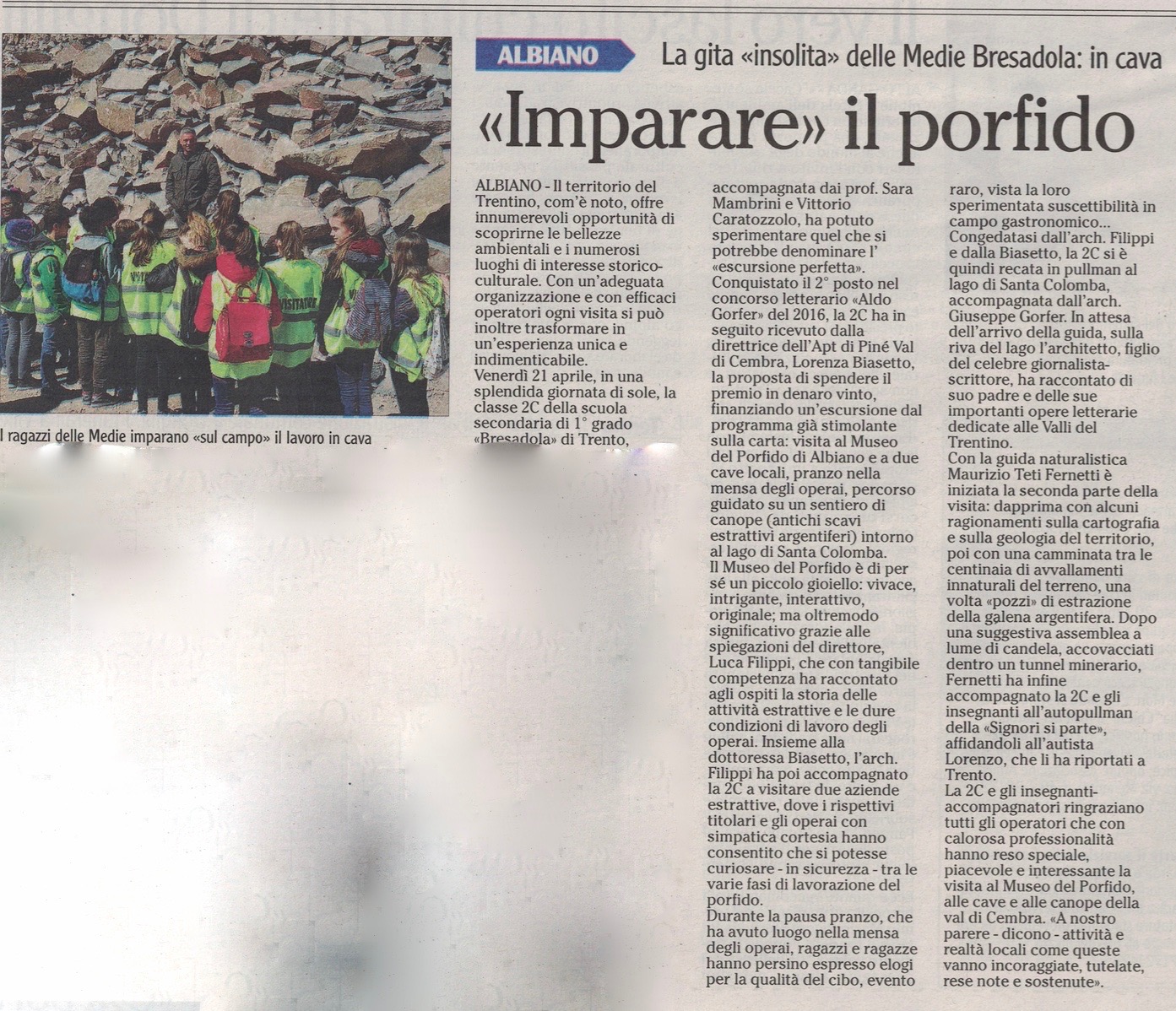 Conquistato il 2° posto nel concorso letterario «Aldo Gorfer» del 2016, la 2C ha in seguito ricevuto dalla direttrice dell'A. P. T. di Piné / Val di Cembra, Lorenza Biasetto, la proposta di spendere il premio in denaro vinto, finanziando un'escursione dal programma già stimolante sulla carta: