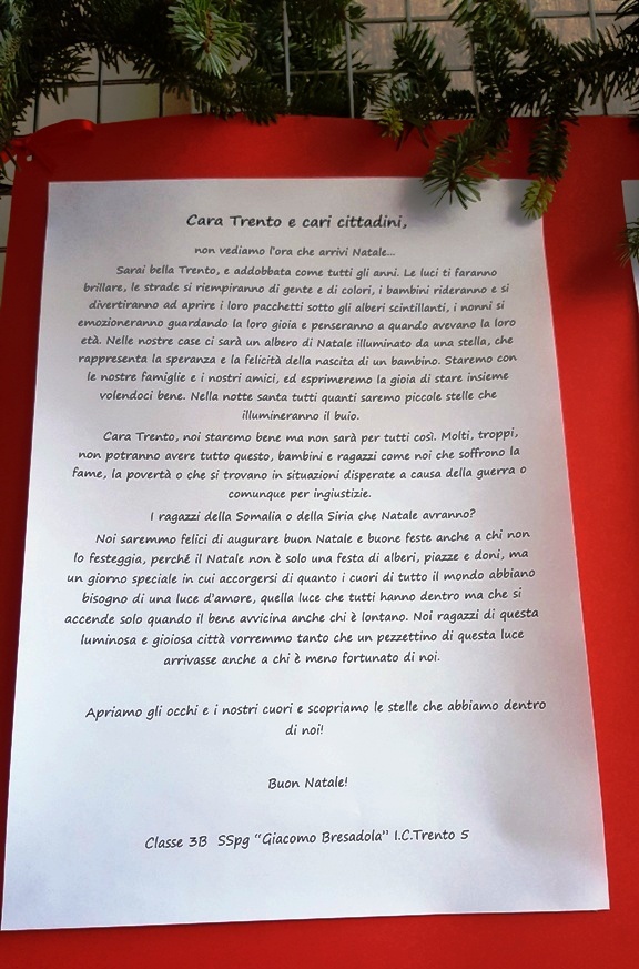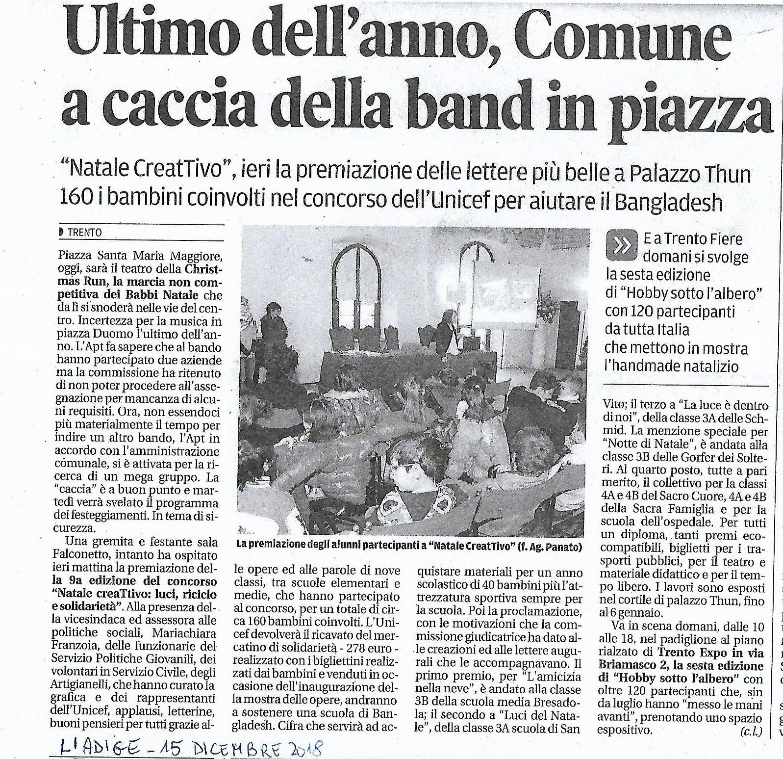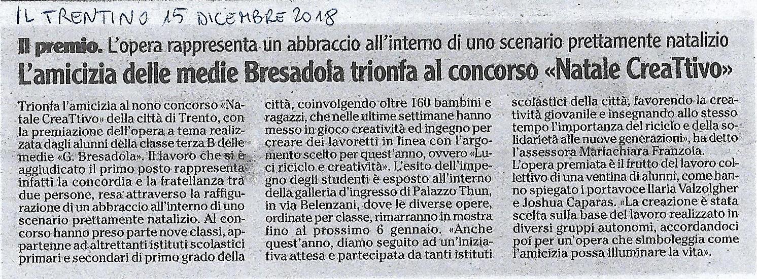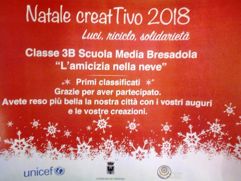 La classe 3B ha partecipato al concorso “Natale creatTivo” 2018 organizzato dalle politiche giovanili del comune di Trento, prensentando un oggetto luminoso dal titolo L'amicizia nella neve fabbricato con materiale di riciclo. Il lavoro è stato accompagnato da una lettera indirizzata alla Città di Trento.