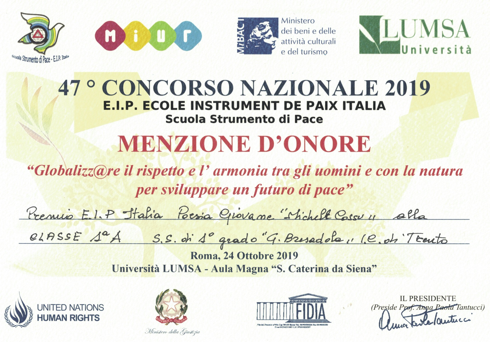Il Progetto «L'Officina della Poesia» realizzato nell'a.s. 2018/19 dalla attuale 2A della scuola "G. Bresadola" è stato premiato dalla Giuria composta dal Comitato Paritetico E.I.P MIUR in attuazione del Protocollo d’ Intesa E.I.P MIUR giunto al terzo rinnovo, con il «PREMIO E.I.P. Poesia Giovane - "Michele Cossu"», con menzione d'onore alla scuola, alla classe e agli/alle autori/autrici/e delle seguenti poesie, pubblicate in un volume: