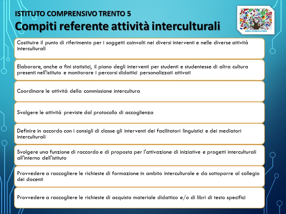 La scuola si pone come obiettivo la piena integrazione di tutti gli studenti e le studentesse e l'educazione interculturale come dimensione trasversale che accomuna tutte le discipline e tutti gli insegnanti. La presenza di ragazzi e ragazzi provenienti da altre parti del mondo e di altre lingue è per l'istituzione scolastica una ricchezza da promuovere e sviluppare.